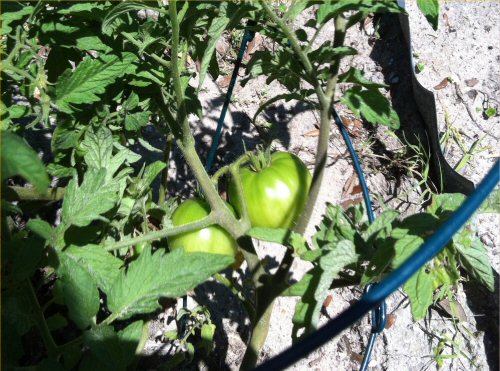 These babies are the fruit of lots of love and prayer. This is the mater plant that froze twice. This shows 2 of the 5 maters on it. One measures 3″ across, the other 3.5″. They are lovely! |